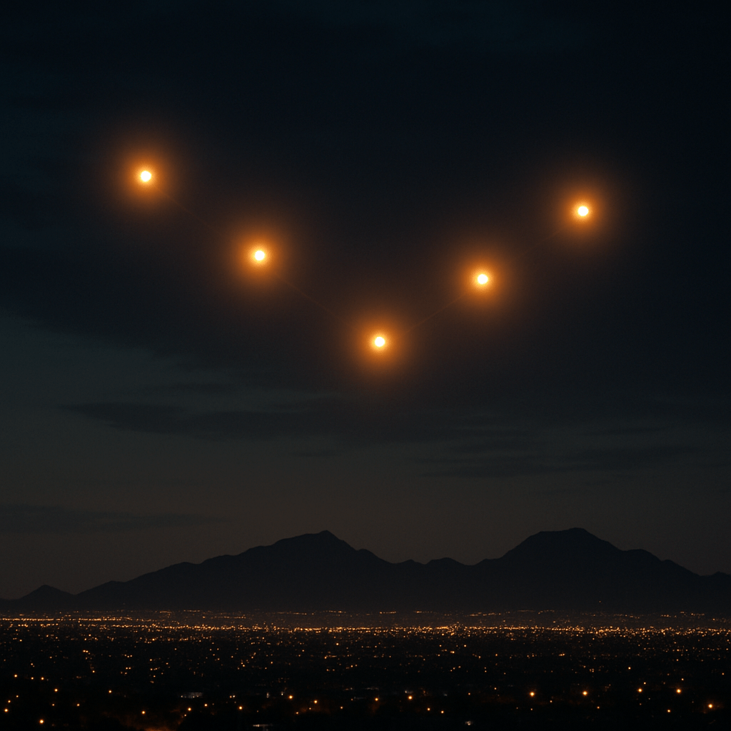 July 14, 2025 – PHOENIX, ARIZONA — More than 28 years have passed since the infamous Phoenix Lights stunned the world in 1997. But last night, the skies above the Valley of the Sun lit up once more. Just after 9:20 PM, on July 13th, 2025, witnesses across Maricopa County reported a near-identical spectacle: a V-shaped formation of glowing orbs drifting silently across the desert sky.