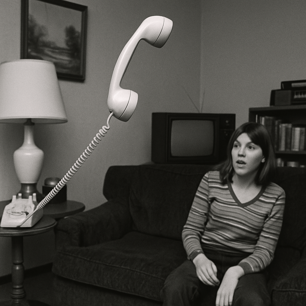 Those who visited the Resch home often spoke of an “electrical tension,” a prickling at the skin, as though static filled the atmosphere. When Tina entered the living room, electronic equipment malfunctioned. Radios hissed with static, television channels flickered without touch, and lights dimmed to a low hum. The air itself seemed to pulse. On one afternoon in March, a visiting photographer captured a now-famous image: a telephone handset midair, the cord taut, as if an invisible hand had yanked it free from its cradle.