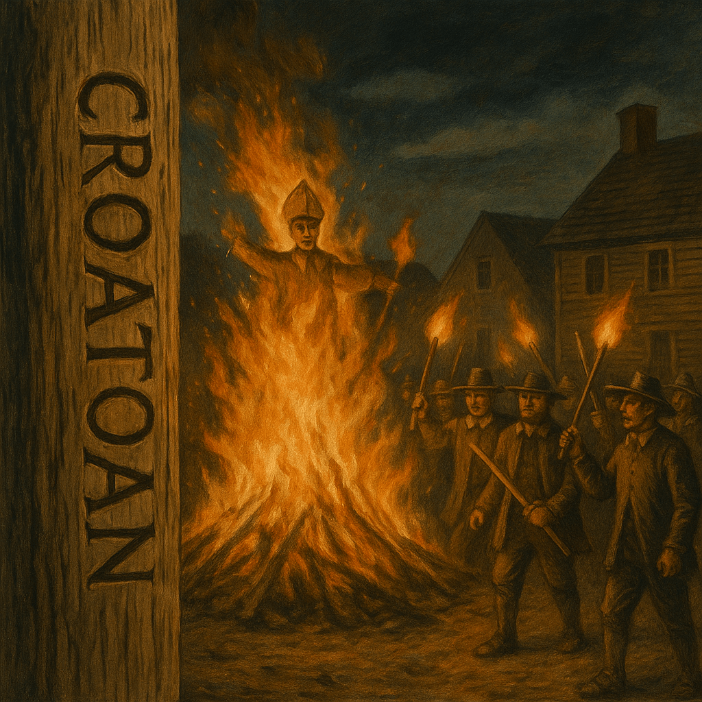 The word “CROATOAN” carved into wood in 1590 and the flames of Pope Night that lit New England skies in the 1700s are rarely spoken in the same breath. Yet both are fragments of a deeper, older anxiety — the colonial fear of disappearance, damnation, and the unseen. Each in its own way tells how early settlers wrestled with the darkness they brought with them and the mysteries they found waiting.