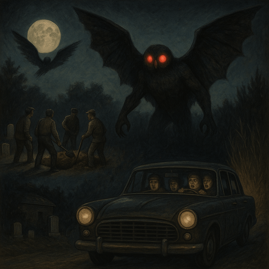 Three days later, two young couples driving near the abandoned TNT plant outside Point Pleasant encountered something far more frightening. According to their statement, a tall, grey figure with glowing red eyes approached their car, then pursued them down the road at what they estimated to be over 90 miles per hour. The glowing eyes were the detail all four witnesses insisted on, claiming they reflected light “like bicycle reflectors,” but appeared biologically alive. The couples reported the event to police the same night, sparking patrols around the area and the first hint of local panic.