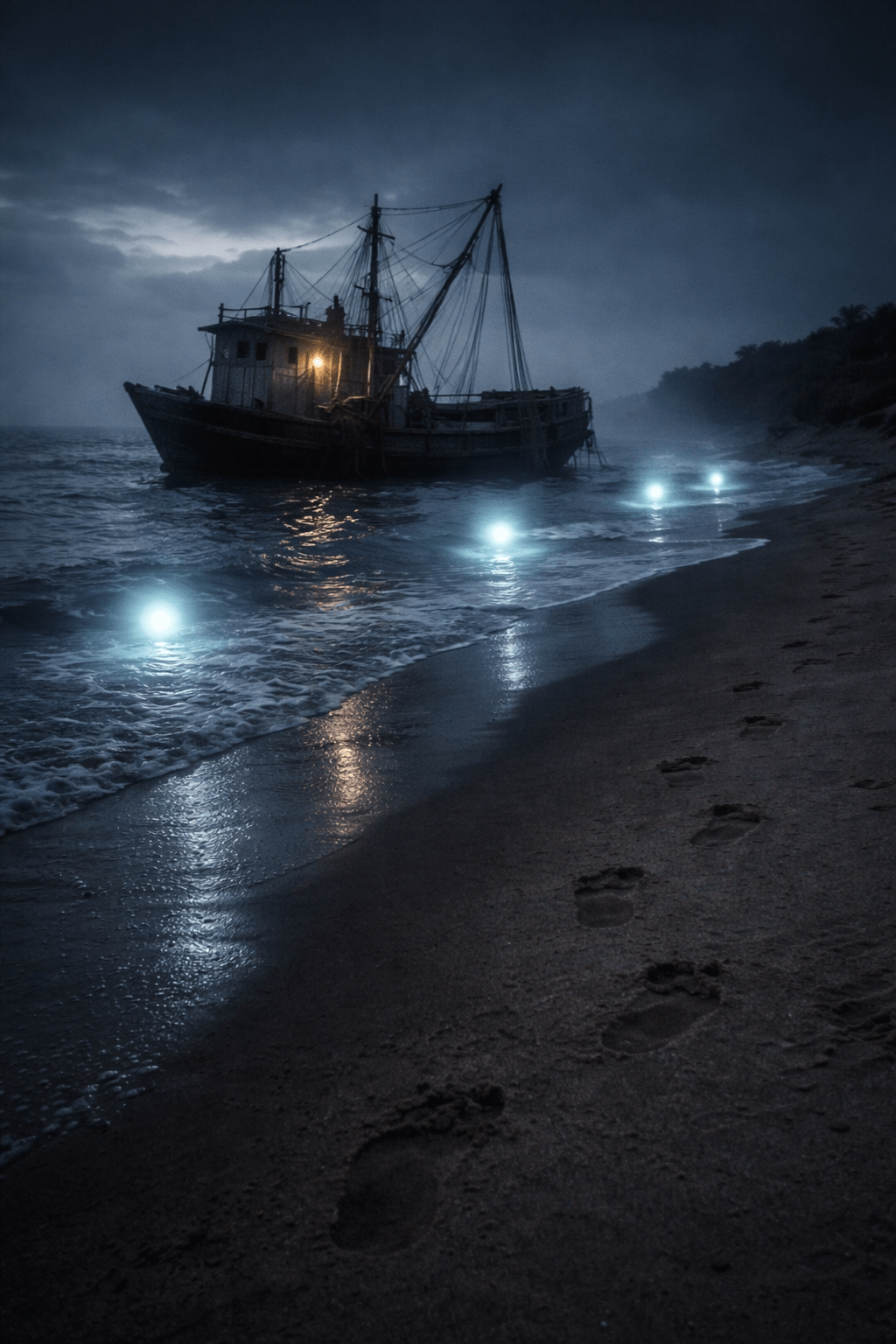 At dawn, footprints appeared where the missing trawler crews should have returned. Bare feet, close together, forming a path from the shoreline to the dunes. But there were no prints leading into the sea. Only away from it. The tracks stopped beneath a wall of mangroves, ending in a clean, sharp line as if the walkers stepped into nothingness.