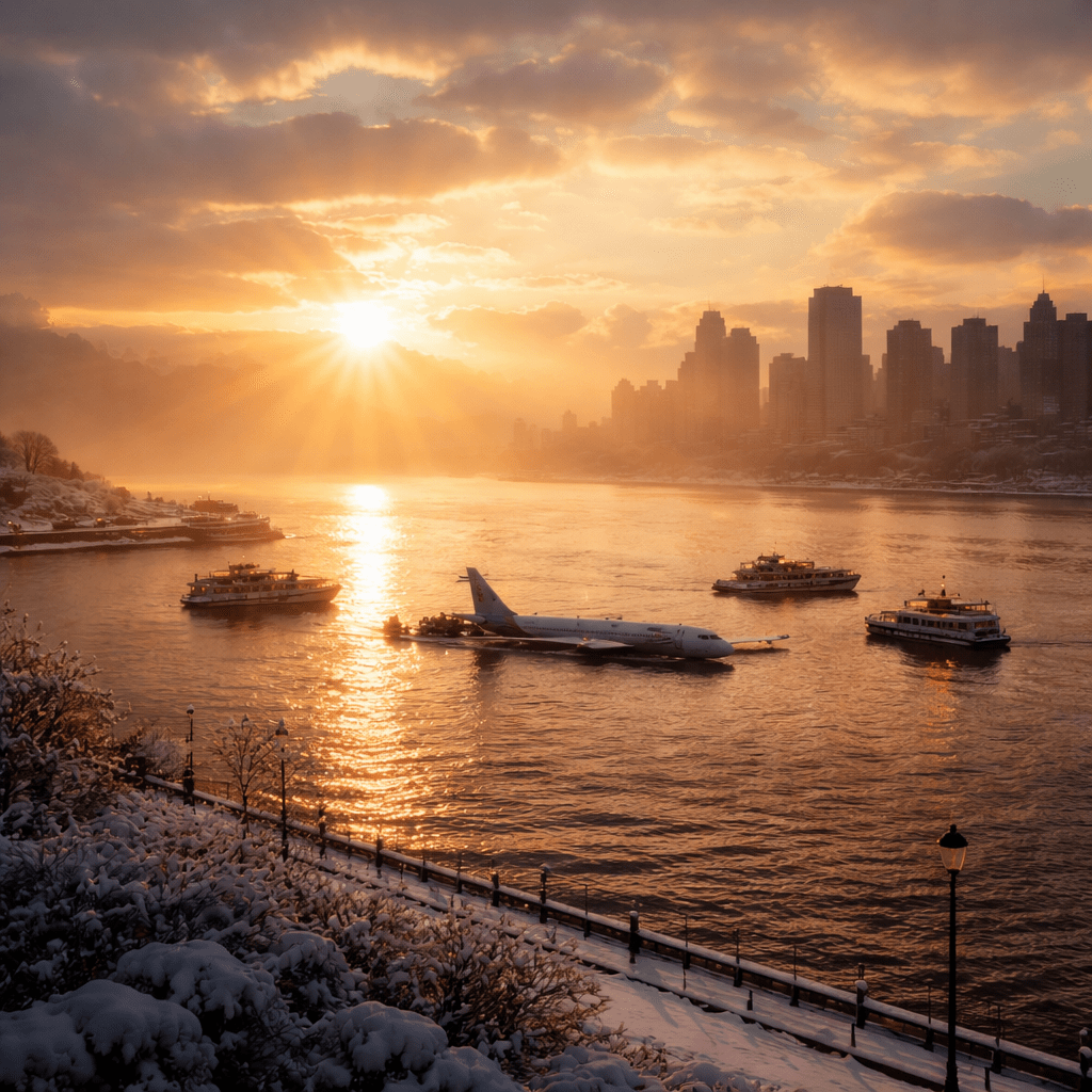 The aircraft came to rest in the river just minutes from active ferries, in daylight, with waters unusually navigable for mid-January.