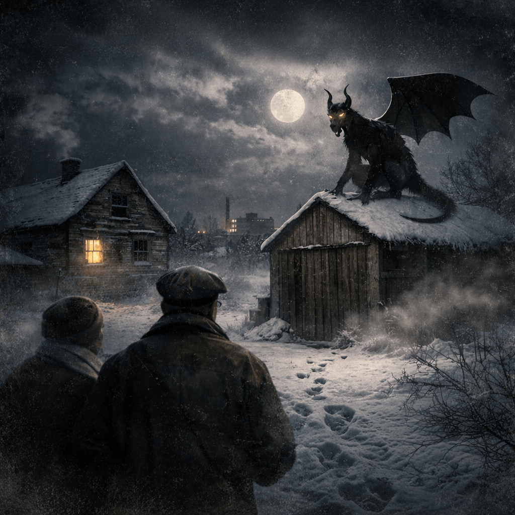 The creature was described as having the head of an animal, massive bat-like wings, and a tail that appeared to move independently. Its cries were unlike any known bird or animal in the region and were said to echo across the frozen streets.