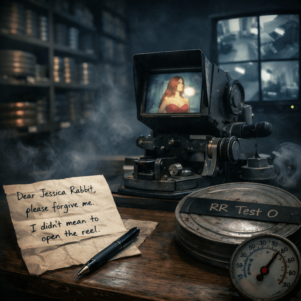 Daniel H., a 34-year-old preservation specialist, had been cataloging background plates and production materials from the 1988 film in a private Burbank archive facility. Around midnight, alone in a temperature-controlled room filled with metal shelves and sealed canisters, boredom set in. On a scrap of paper, he scribbled: Dear Jessica Rabbit, please forgive me for opening the reel. I promise I didn’t mean to disturb your world. He placed the note beside a sealed film can, amused at his own absurdity, and returned to work.