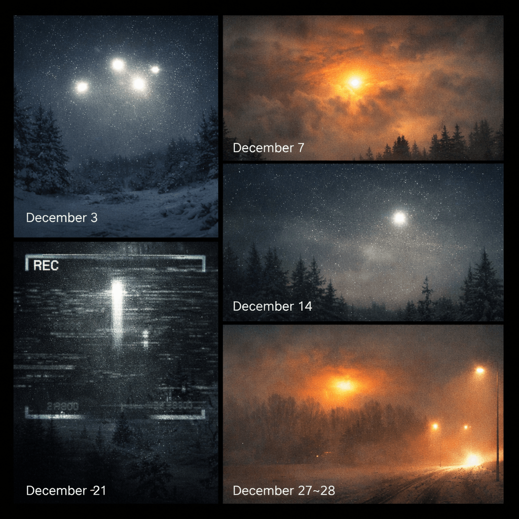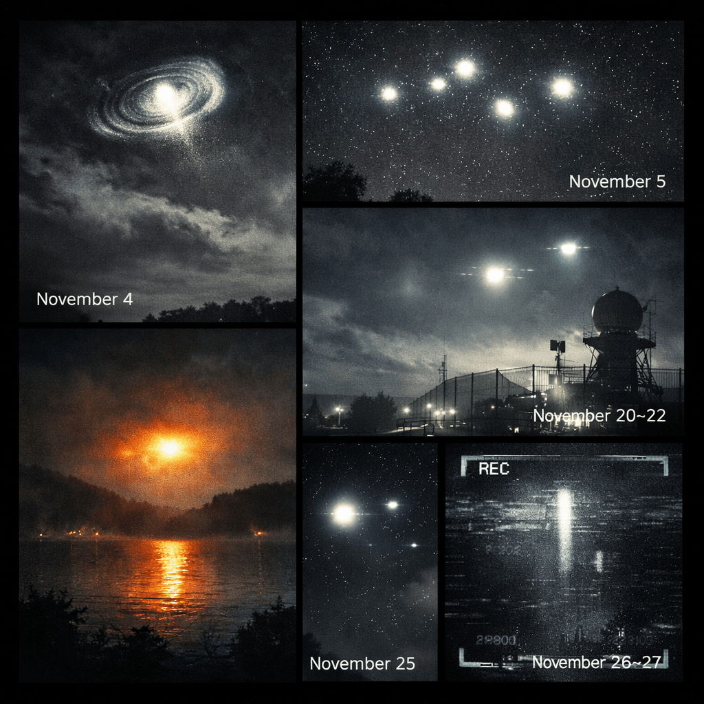 - November 26–27 — Short video clips circulated showing unusual sky lights and brief visual anomalies, with no confirmed cause.