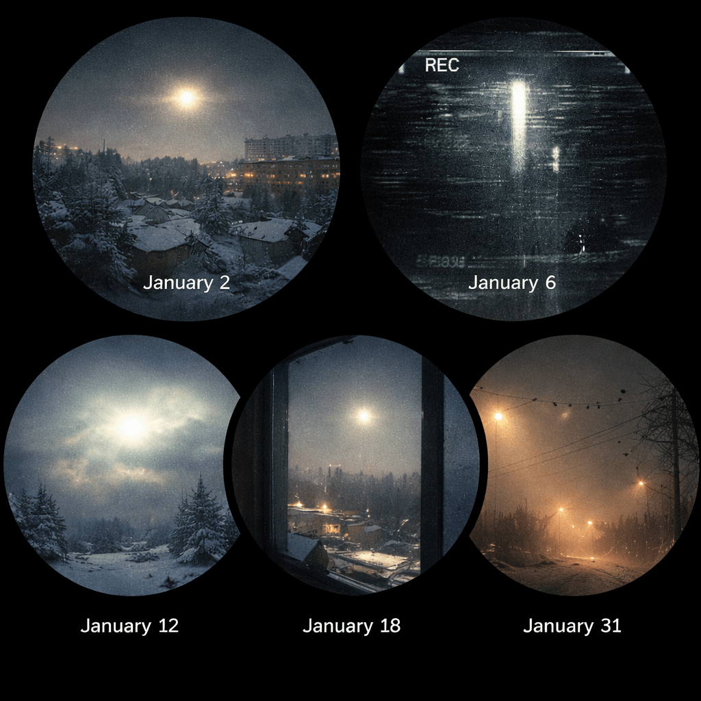 - January 12 — Multiple witnesses described a pale glow diffused through heavy cloud cover, creating the impression of illumination without a visible source.